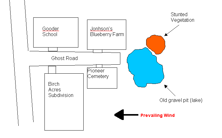The Ghost Road lake is an old gravel pit that is filled with water. Neighborhood kids swim there in the summer. They also fish there, but seldom catch anything. Both Jonhson's Blueberry Farm and the caretakers of the Cemetery use the water from the lake for irrigation. Birch Acres Subdivision has city water piped in from far way. Gooder school is also on city water, but the school has not been used for several years because the school population has been declining. A contractor wants to buy the gravel pit and surrounding land. She plans to mine gravel for a road being built not too far from there. Before the bank will lend the contractor money, the bank hires an environmental consultant to review the site and assure there is no contamination. The consultant notices the stunted vegetation and takes some soil samples and also samples the water in the lake. The samples indicate that the soil under the stunted vegetation is heavily contaminated with pentachlorophenol (PCP), a wood preservative. The PCP was probably the result of the operations of the contractor who dug the gravel pit. He treated wood on the site. (Go here read a little on pentachlorophenol. It is on the RAIS site and is also one of the defaults in your Level I program.) There is none in the lake water. Now to start you exposure analysis, fill in this table regarding the area where the vegetation is stunted: