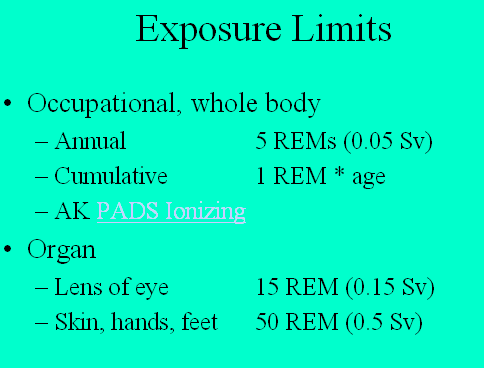 Here are the exposure limits set by worker health authorities (Alaska and Federal are similar).