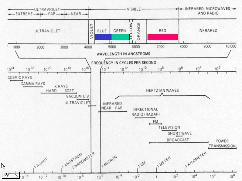 The upper part of the sketch shows the visible part of the spectrum, and also the near-visible portions you are familiar with, infrared that warms you, and ultraviolet that gives you a sun tan and increases your chances of skin cancer. (The sketch gives the wave length in angstroms, a seldom used unit these days, but which is a tenth of a nanometer. Anyhow the scale goes from one tenth of a micrometer to one micrometer.) Note that the near visible portion is then funneled down into the entire spectrum, of which it is only a small portion.