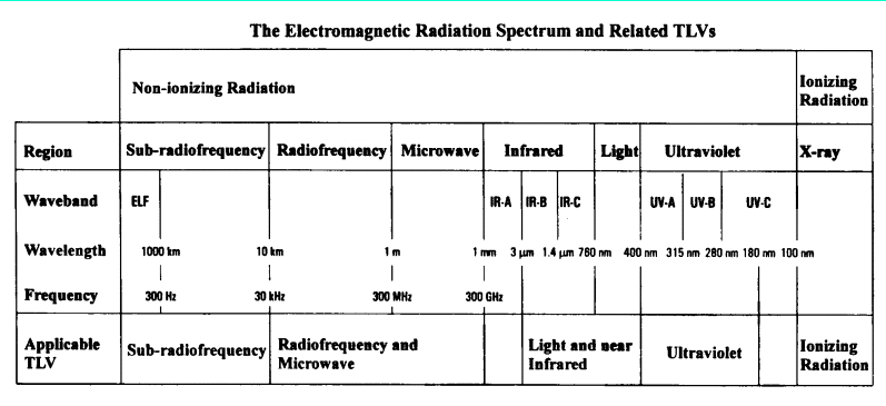 So you might have guessed that the applicable health and safety standards are dependent on the frequency of the non-ionizing radiation. Here is a sheet from the TLV booklet ©ACGIH that tells you which section of the TLV book to look for standards: