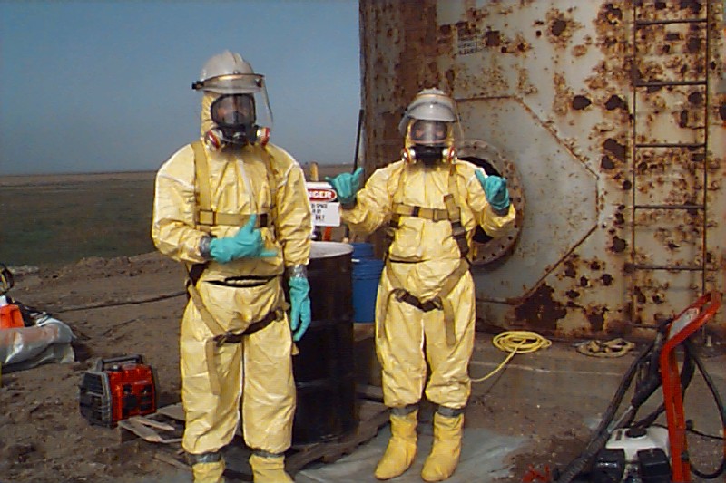 Here are the workers about to enter the vented tank to clean the gunk. Note this level B protection with one exception. What is it?