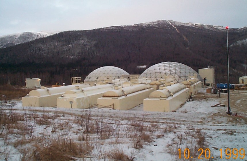 Here is a tank farm. The two large domes are temporary shelters associated with the construction. The 8 tanks are in the foreground. These are "self-diked" tanks. That is, the tank is cylindrical, but the bottom portion is inside the box structure. If the tank leaks, it flows into the box and is detected. If the tank leaks above the box, it is visible, also the whole area is inside a dike.