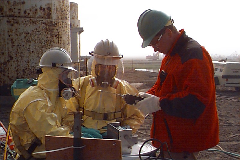 The worker in red is holding a testing meter.