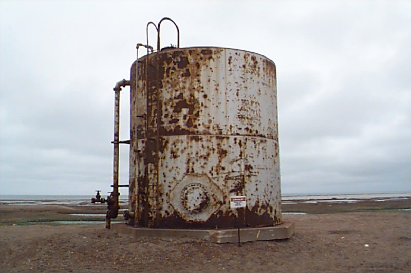 A rusty tanks on the coast. Note the hazard climbing the rusty ladder. The "manway" is the bolt circle at the bottom. The small pipe hold the wires for the depth of fill gage. This was a concrete foundation on permafrost. But the foundation was apparently adequate.
