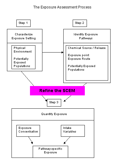 The final output, pathway-specific exposure, will be combined with dose-response relation to state the probability of some adverse health effect to some class of receptors from a particular pathway. For example, the increase in risk of cancer to adults in the Elmtree subdivision due to TCE in the drinking water is XXX. For the adults in the Elmtree subdivision, you might also consider the increase in cancer risk from showering with the TCE contaminated water. You would do an exposure assessment of both the drinking water pathway and the shower water pathway.