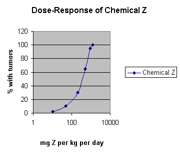 If we wanted the dose that would cause a tumor in one out of a million, it is just 0.00033 gm/kg-day. We can calculate any risk we want. This save rats, and is otherwise very practical. Note several things. It is based on the "no threshold theory." A chemical could reach zero effect at some much larger dose, but we are assuming it does not. Once a chemical is known to cause cancer at some high dose, it is always possible to calculate a carcinogenic effect, no mater how small the dose.