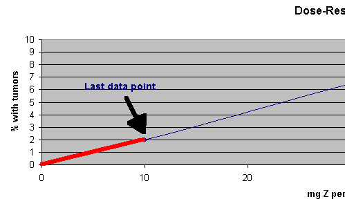 Besides the obvious practical problem, there are several theoretical problems. As you move to lower and lower doses, the curve flattens out and large changes in dose result in small changes in effect. Lower doses are inherently more difficult to measure and analyze. This problem was long ago noted and except for a few very expensive tests to explore some low dose theory, no one tries to analyze in this very low dose range. The EPA and others have instead relied on extrapolations, from high to low dose. Here is the lower end of the chemical Z test: