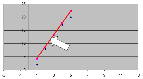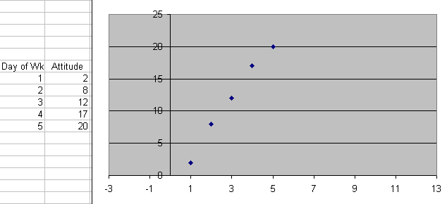 We might use an extrapolation of the data to estimate the student's attitude on Saturday night. The extrapolation would indicate the attitude would be around 25, the best attitude all week. Of course the student might be studying that weekend and have a poor attitude on Saturday night. Or we might extend the extrapolation to day 8, the Monday of the following week and estimate that the students attitude would be far better than last Monday.