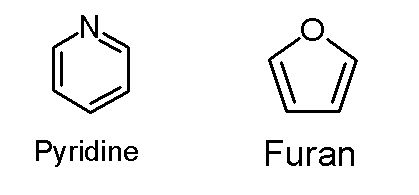 Pyridine is a solvent and industrial chemical, colorless to yellow liquid with a nauseating, fish-like odor. It is quite toxic. Furan is a laboratory solvent and industrial chemical.
