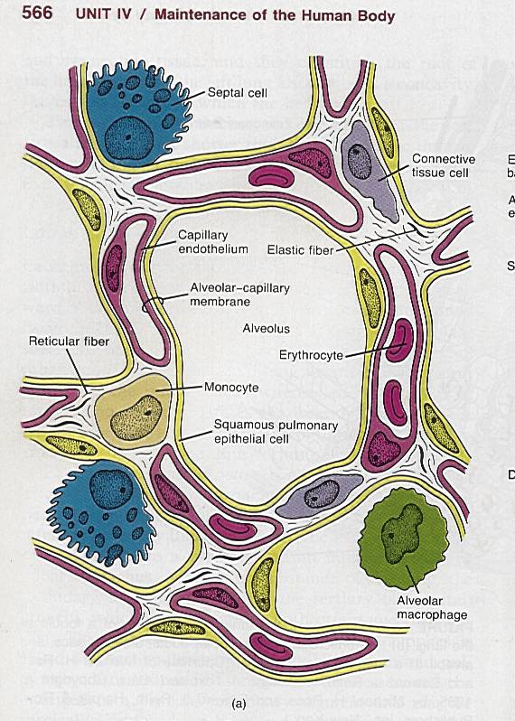The red rings are the capillaries. The doughnut shaped cells in the middle of those are red blood cells, called erythrocytes. The capillary is actually a tube made out of cells with very thin walls. The cells are called endothelial cells and the wall is the "endothelium." The alveolar-capillary membrane is very thin, typicality less than 0.5 um. It is here where gas is transferred. Two other cells types are shown, a monocyte is a type of white blood cell. The Alveolar macrophage is another type of white blood cell, it is not attached to the walls of the alveolus and moves around inside the alveolus. We'll talk more about macrophages in the submodule on asbestos. Some terminology: In most organs there is a "business end," the cellular portion of the organ that does the biochemical or mechanical function of the organ and this is called the parenchyma. The connective tissues that support these are called stroma. In the cartoon above, I'd call the Type I and II pneumocytes and the capillaries the "parenchyma" and the connective tissue the "stroma."