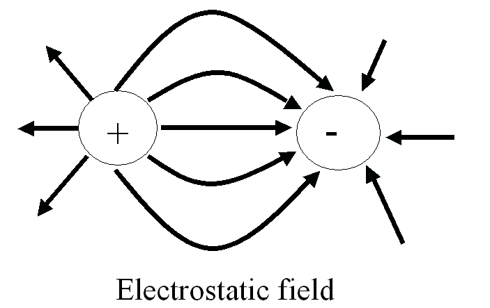 Here the electric field between a positive and a negative charge would pull the two charges together. This field exists in a vacuum, without any medium between the charges.