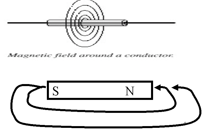 There is a magnetic field between the north and south poles of a magnet. This field also exists in a vacuum. Magnetic fields also exist about a conductor through which charge is moving.