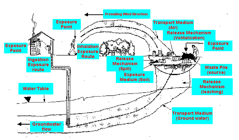 3. There are three "media" that are contaminated, but since the contaminant is moving in or through two of the media, we think of these as transport media, rather than "sources." Soil might be a transport medium, if it is blown by wind or moved by water runoff.