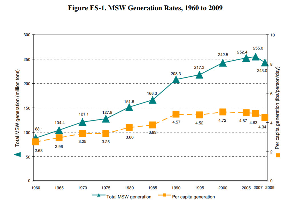 Below we see that the per capital generation of MSW has declined since 1990, while the total has increased, probably with population increase. The EPA that generated the report states this is due to recycling.