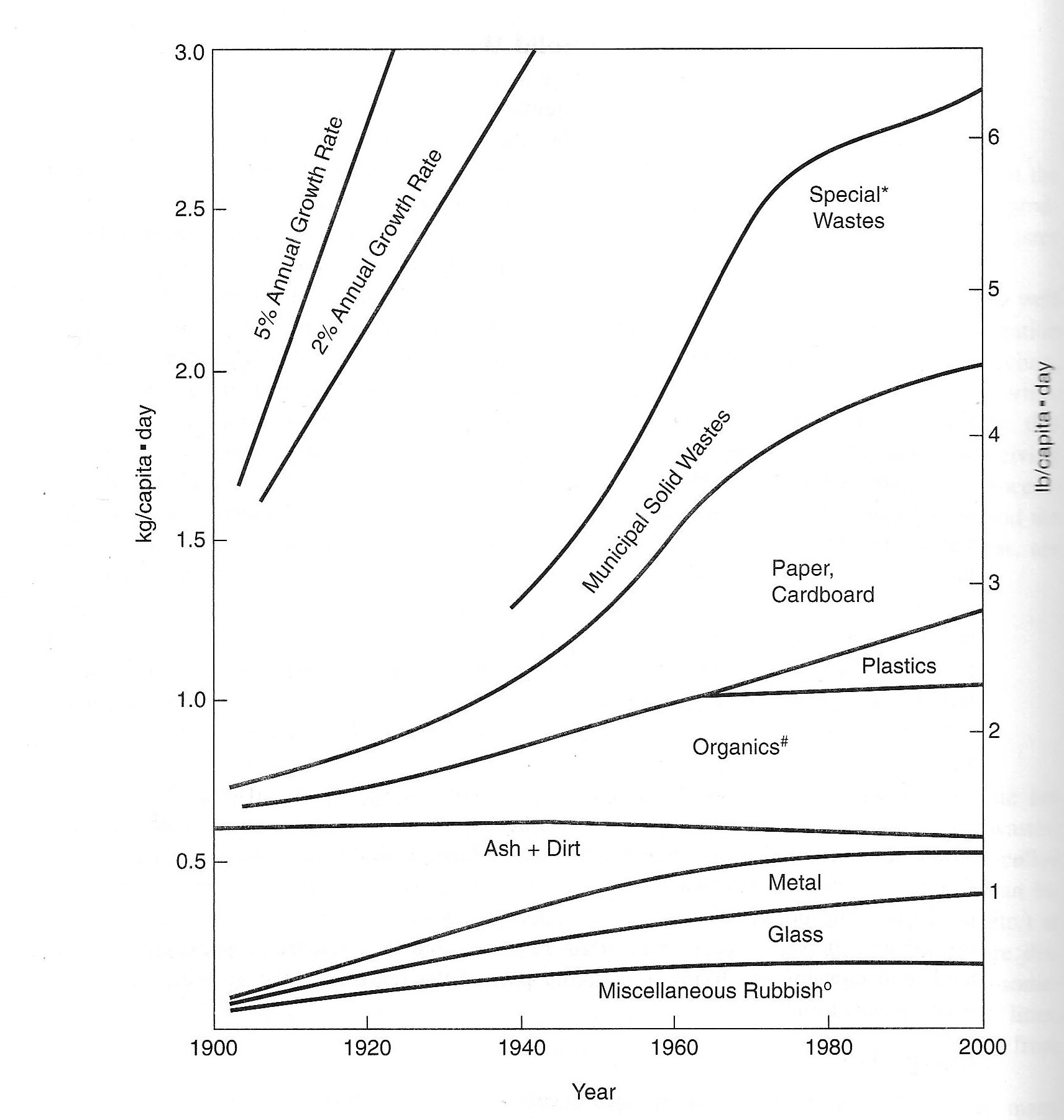 (From Henry and Heinke) Note the right hand axis is pound per person per day. The MSW line is the total. See that Ash and Dirt decline due to the change in home heating from wood and coal to oil, gas, and electricity.