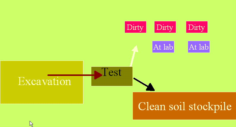 The excavated soil is tested, perhaps by the truckload. Or it may be placed by excavator bucket in one location and piles of reasonable dimensions formed, then these are tested with a "field screening test" of some sort. If the test indicates the soil is not contaminated, it is scooped up and taken to a clean soil stockpile. If the test indicates it is contaminated, it is scooped up and taken to piles that are known dirty. If the field screening test is not conclusive, samples are taken for off-site laboratory testing and that soil is moved to holding piles. The details of this process, the size of piles, the amount of field testing, the qualifications of the personnel doing the testing, and such details are decided by the PRP and approved by the regulators before the process starts. One item that is always in the plan is that all the dirty and suspected dirty soil be placed on watertight plastic liners.