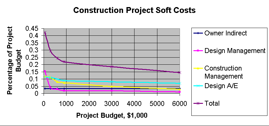 In managing government construction projects, a distinction is sometimes made between "hard costs," the actual construction costs, and "soft costs" which are all the project costs that are not construction. For example owner's overhead, design (A/E)consultants, and project management which includes both management of the design process and management of the construction process, including inspection. Here is a chart of each of those soft costs and their total, as a percentage of the project budget, based on about 20 municipal projects: